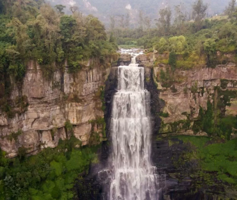 A cascata é formada pelo Rio Cristal, que tem seu início nas montanhas de Antioquia e percorre mais de 100 km antes de desembocar em um grande cânion, criando a impressionante queda d’água. O espetáculo é magnífico, com a água caindo em uma piscina natural escura, criando uma névoa que cobre toda a área ao redor. É uma visão que parece saída de um conto de fadas.