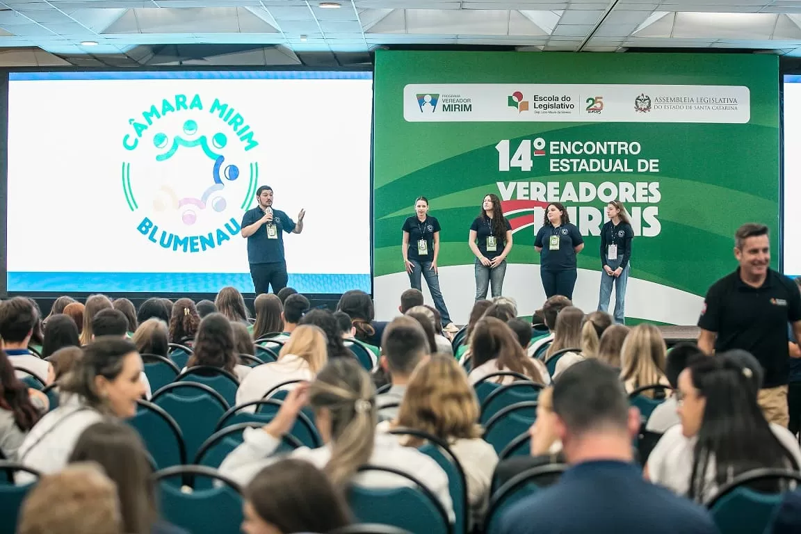 A Câmara Mirim de Blumenau, representada pela sua Mesa Diretora, marcou presença no 14º Encontro Estadual dos Vereadores Mirins, realizado nesta quarta-feira (1º), no CentroSul, em Florianópolis. O evento reuniu mais de mil adolescentes de 70 Câmaras Mirins de Santa Catarina, promovendo debates, oficinas, troca de experiências e formação política para jovens estudantes.